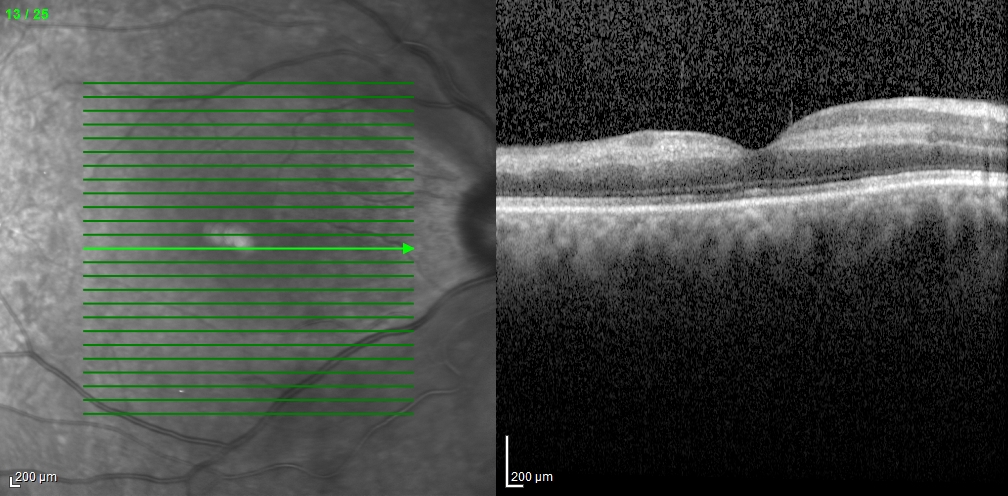 This patient had a central retinal artery occlusion with partial sparing of the papillary-macular bundle by a cilioretinal artery. The fundus photo shows retinal whitening except nasal to the fovea. The fluorescein angiogram shows that the central retinal artery has recanalized. OCT shows central and temporal swelling of the inner retinal layers with loss of discrete layer boundaries, with sparing about 800 microns nasal to the fovea.