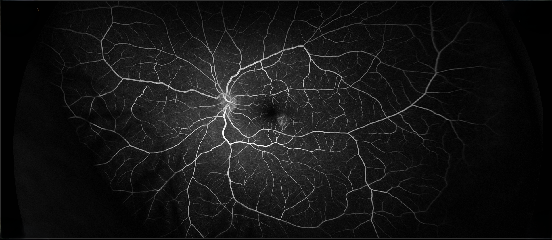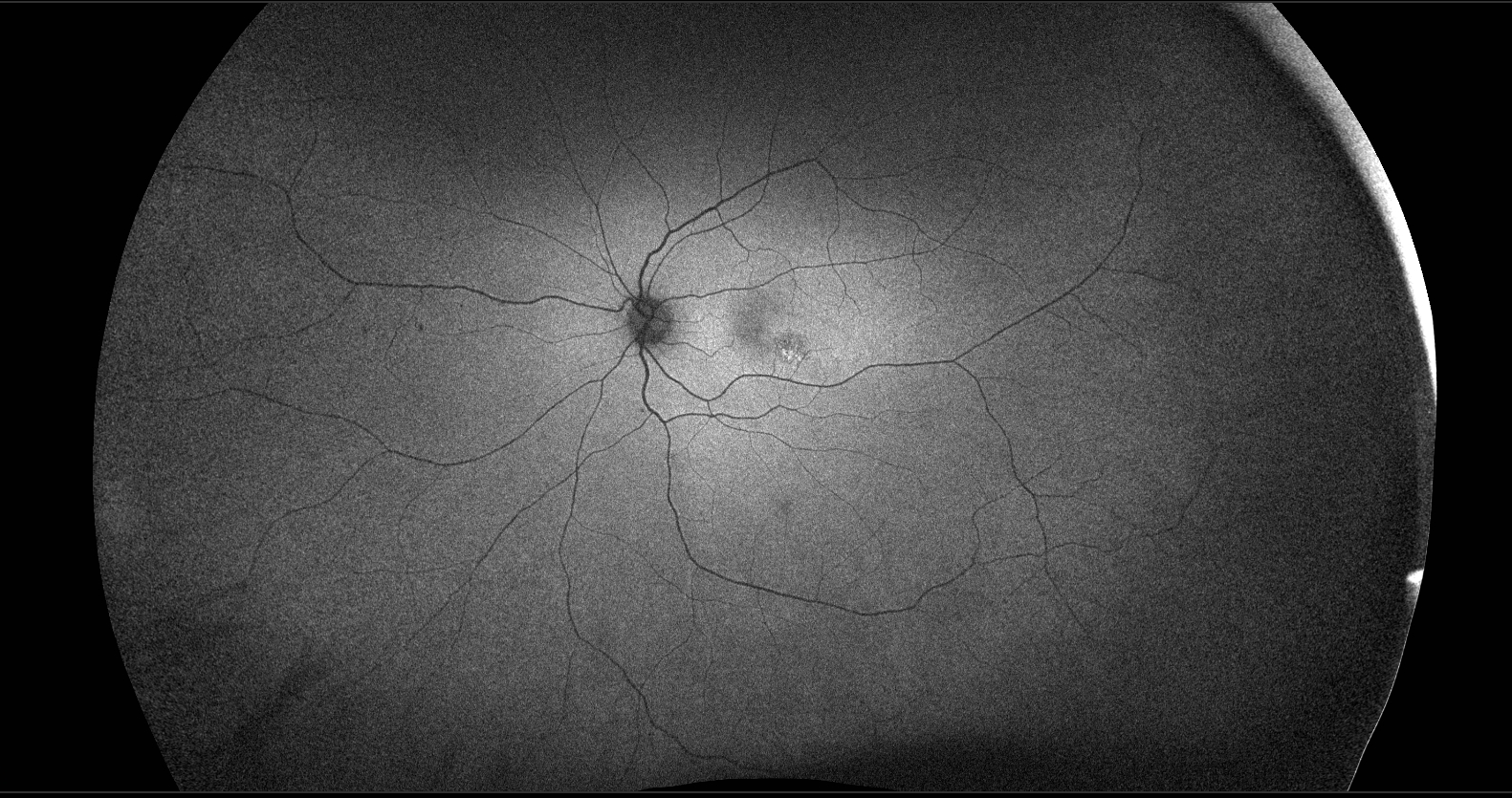 The patient had a small, flat pigmented lesion in the left macula. Fundus autofluorescence showed punctate hyperautofluorescence. Optical coherence tomography (OCT) demonstrated a minimally elevated choroidal mass that had replaced the normal choroidal vasculature. There was a serous pigment epithelial detachment without subretinal fluid or macular edema. OCT angiography did not reveal a choroidal neovascular membrane (CNVM). Fluorescein angiography showed mottled hyperfluorescence in both early and late phases without evidence of leakage.